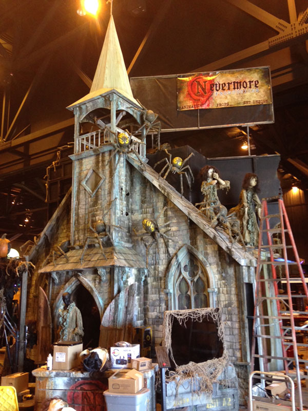 20ft wide, 4ft deep, and a staggering 28ft tall. Comes with two working double doors and stained glass style windows.