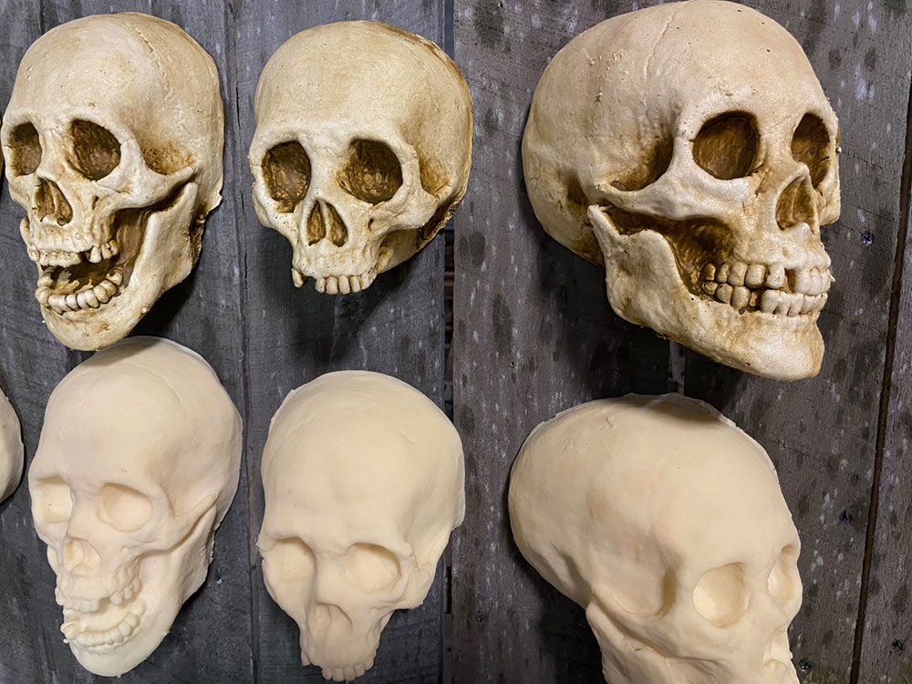 These are flat back skulls, skinned with a thick layer of latex and backed with a light polyfoam. They are great for in high traffic areas where guests will constantly brush against and be tempted to pick at the skulls. They will not chip or have chunks broken off due to the latex. We have 5 profiles available, they can either be bought painted or unpainted.