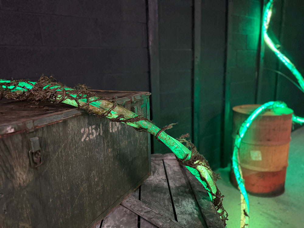 SPECS – Vines are approx. 24ft long and come with heavy duty paracord loop on both ends for hanging. They run on the provided 24VDC power pack but can also link several end to end. Each vine has 2 LED fixtures that run independently of each other for limitless color/pattern combos. Made with very durable materials that can be placed right in the pathway of customers providing they are properly secured and plug in ends are out of reach.