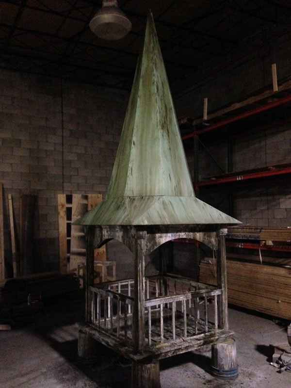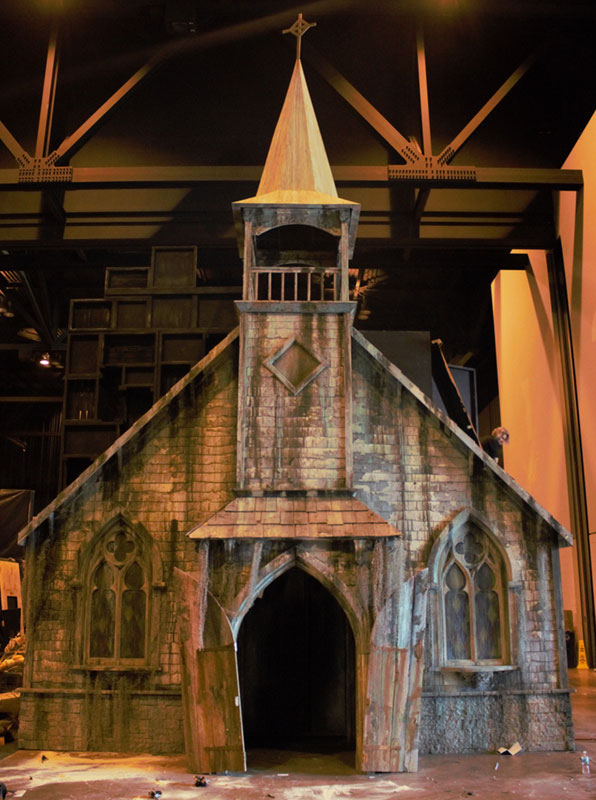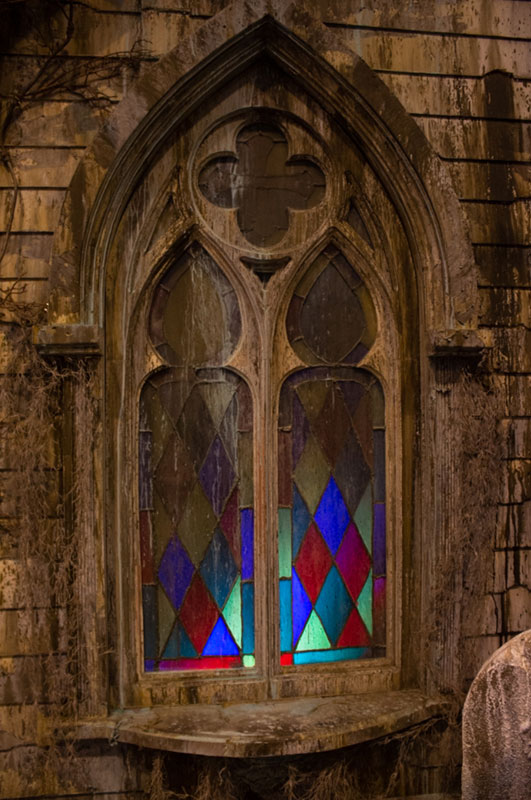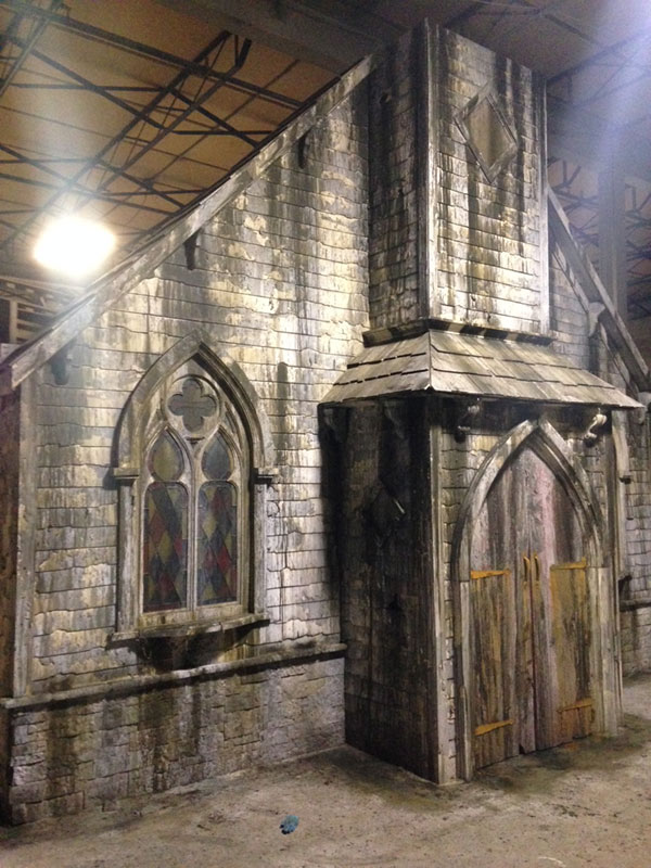 20ft wide, 4ft deep, and a staggering 28ft tall. Comes with two working double doors and stained glass style windows.