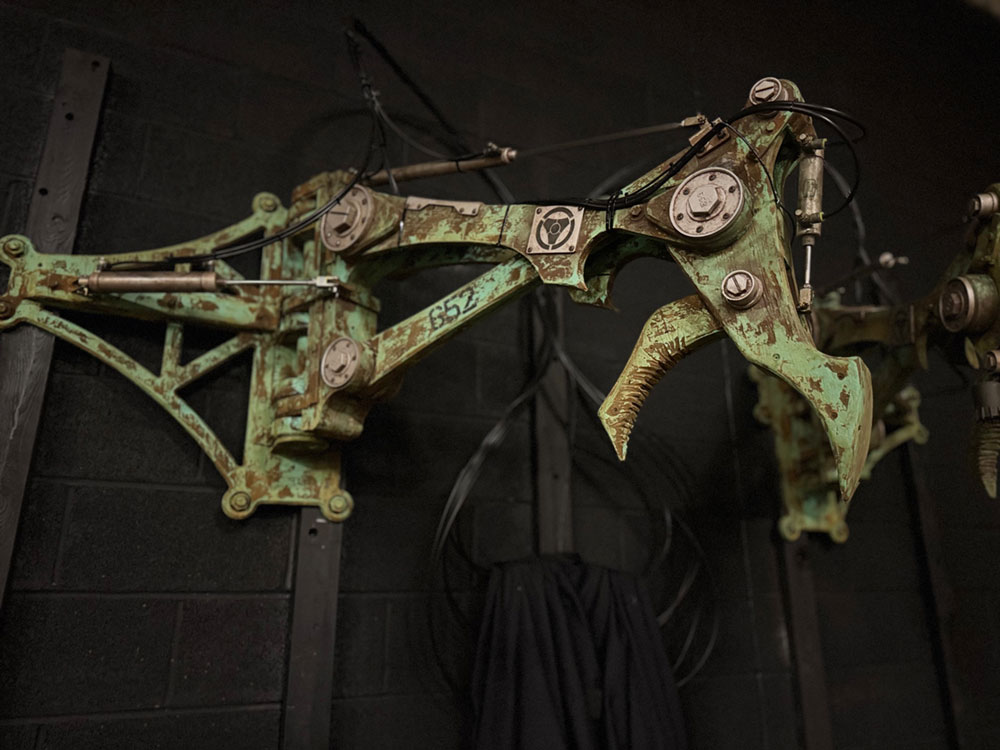 SPECS - Back mounting base is roughly 30" x 30" and claw extends just under 5ft off the wall in it's extended position. Designed to mount to a wall or other vertical structure. Requires 100 psi and power. Comes with sound file loaded on the controller. (Barrel in pics for scale only)