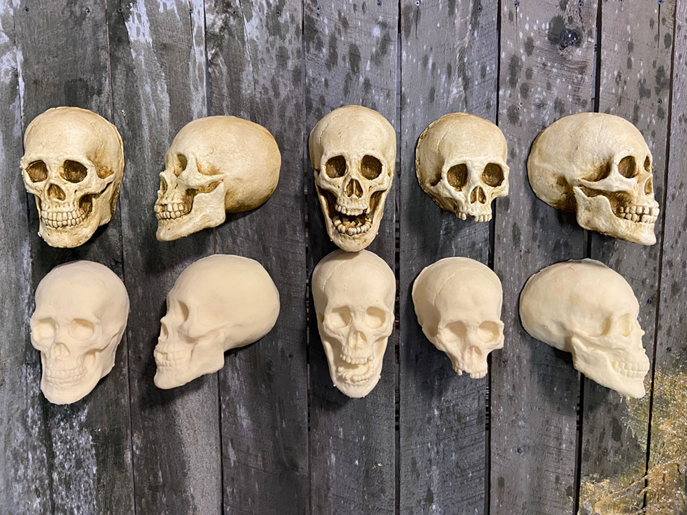 These are flat back skulls, skinned with a thick layer of latex and backed with a light polyfoam. They are great for in high traffic areas where guests will constantly brush against and be tempted to pick at the skulls. They will not chip or have chunks broken off due to the latex. We have 5 profiles available, they can either be bought painted or unpainted.