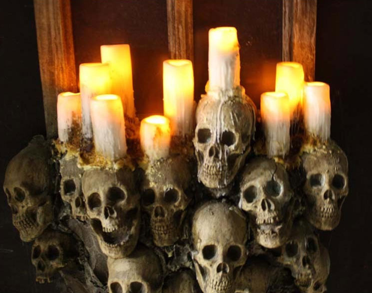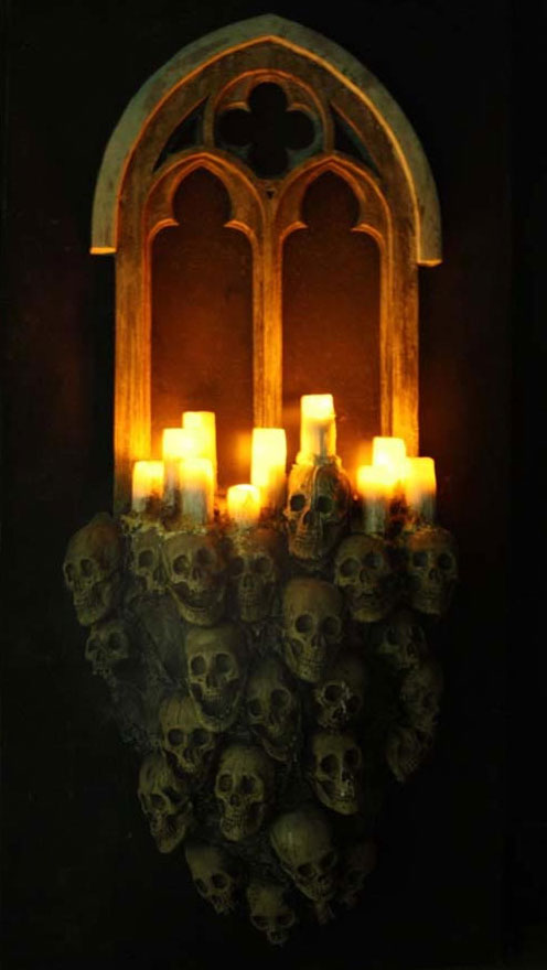 This piece speaks for itself. Beautiful and elegant yet dark and gruesome. Real melted wax candles drip over aged skulls mounted to the bottom of a tarnished gothic window.