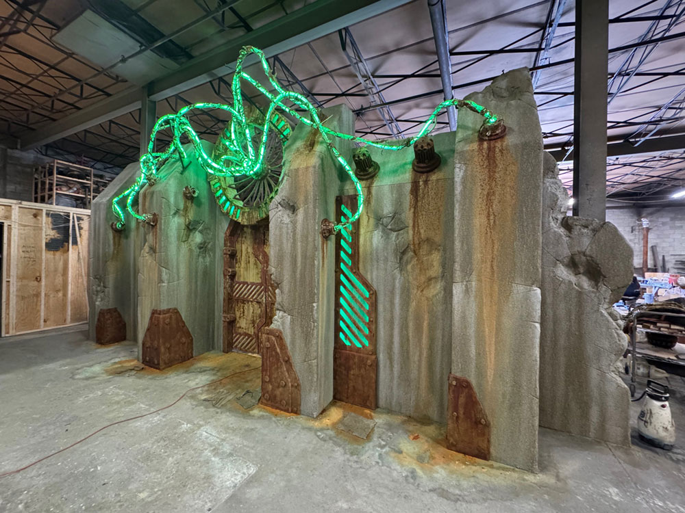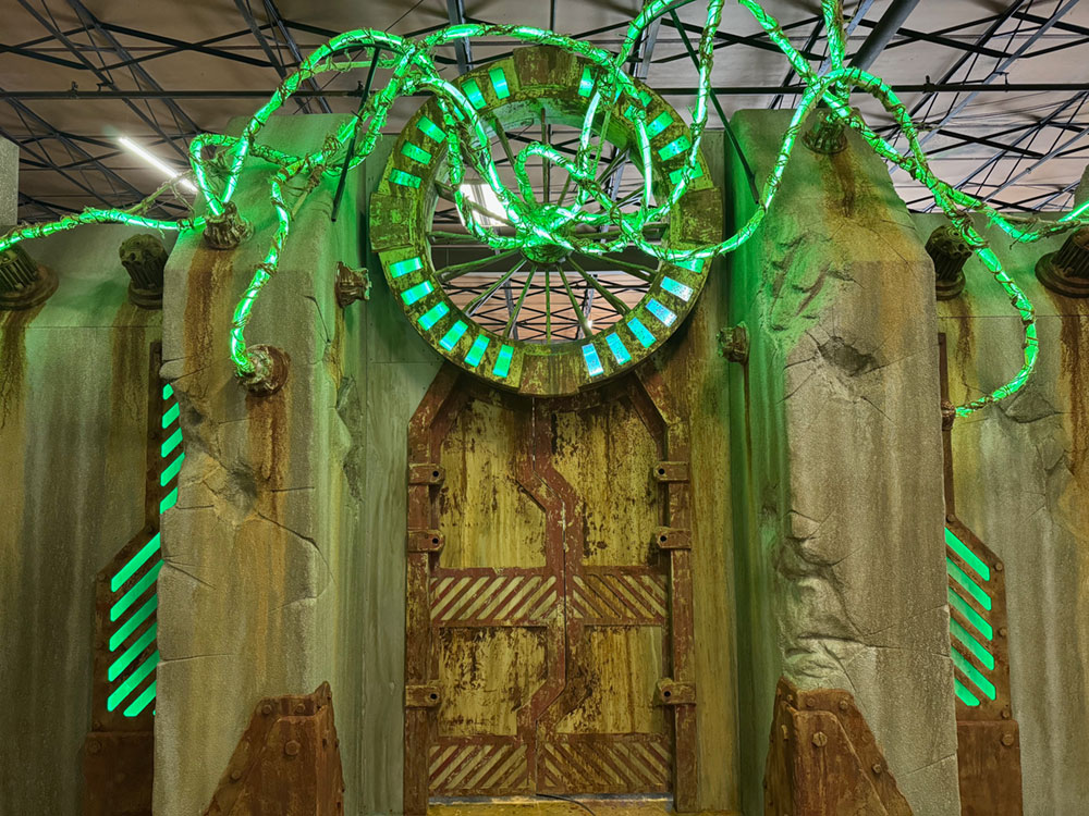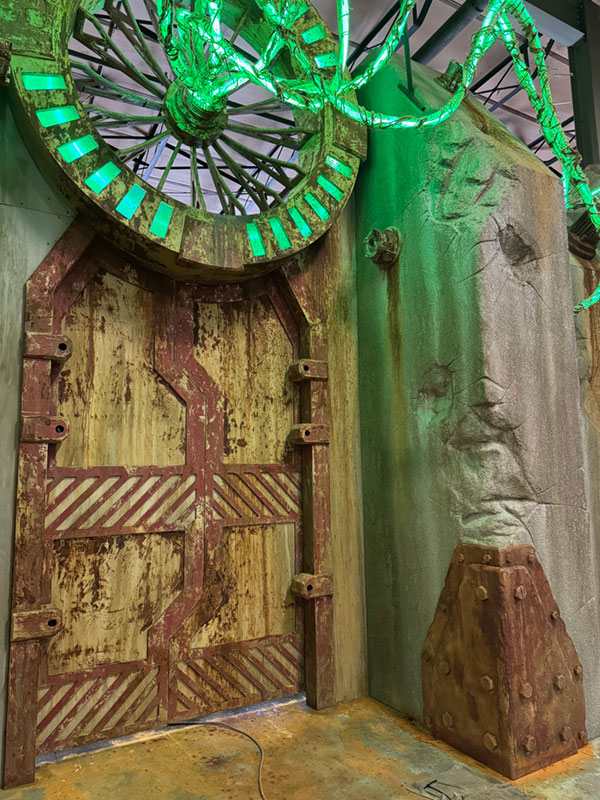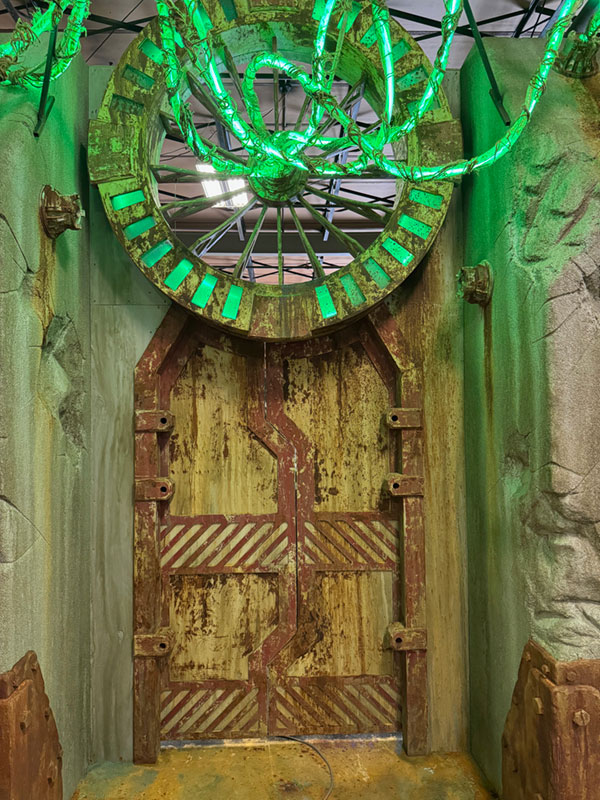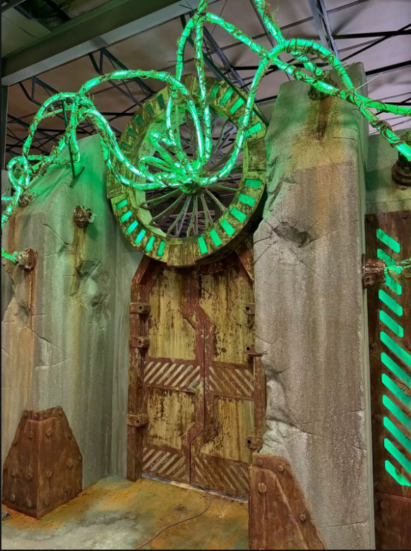 30ft wide, 14ft tall, 3ft deep. Comes with glowing vines and LED backlit details. Comes standard with hinged door, or upgrade to double sliding pocket door.